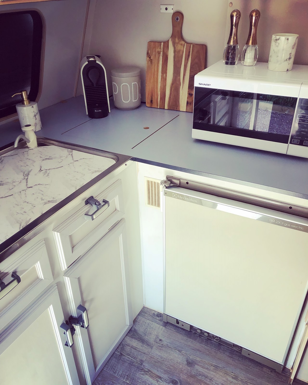Poppy was loved and had excellent bones, so we really didn't have to do too much inside just a lot of feminine touches. New wood grain flooring, marble accessories, rose gold salt and pepper shakers HELLO! Chopping block, coffee machine and all the creature comforts to take on the road (colour co-ordinated of course)