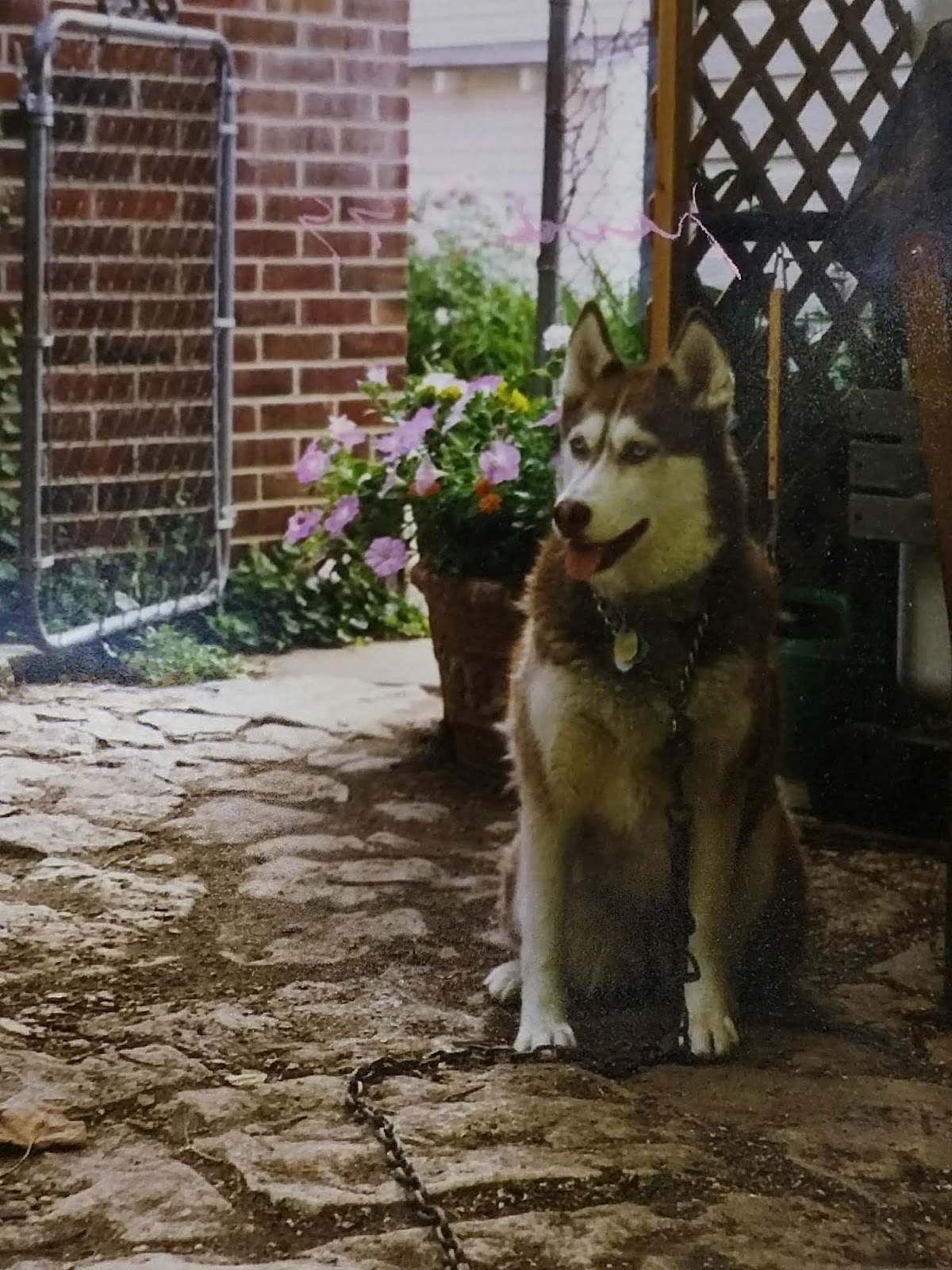 There's information in this image. That face is supremely alive and invested in its world. No other dog that I have known has ever been so aware of her surroundings. The brick wall is free of ivy because Roxie decided to gnaw the weedy vine off at the ground. That 4-foot fence and gate weren't obstacles. That's why the heavy-duty chain is attached to a don't-shit-with-me pinch collar. Yes, that sounds horrible, but we live a short city block from a busy 4-lane road, and not only could Roxie have been killed or maimed, she could have precipitated a crash that would have hurt innocent people. And even those Medieval devices weren't perfectly reliable. Pinch collars broke every year or two. And that giant chain eventually wore out at the swivel. Roxie liked to pull and test and pull and test. A thousand shades of stubborn. That was my dog.