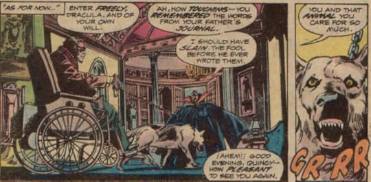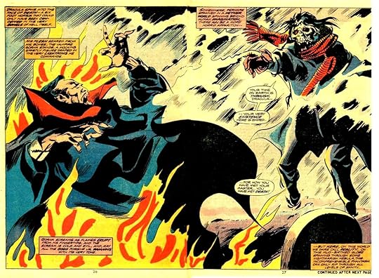 Now we come to the cream of the crop, the top dog, the head of the class, the king of . . . the best horror comic Marvel produced in the 1970s, and one of the best comics produced anywhere ever!TOMB OF DRACULA.This is the story of Count Dracula trying to expand his empire of the undead in the modern world pursued by a team of vampire hunters descended from the same crew that dispatched him in the original novel. The first year of the book was uneven because of rotating writers and artists, but soon it acquired one of the legendary creative teams of all time, and they stayed with the book until it was cancelled with issue #70. Writer: Marv Wolfman (yes, that’s his real name). Artists: Gene Colan and Tom Palmer. These guys are the best. THE BEST.The book had an over-written pulp sound to it, which served its neo-Victorian sensibility. It was like a Dracula movie from Hammer Studios, but bigger and wilder and much more personal and emotional. Individual issues were often repetitive with lots of stalking and biting and last-minute escapes and Dracula threatening everyone in sight. But taken as a whole, the 70-issue run of Tomb of Dracula is one of the greatest achievements in comic book history. The Count appears in every issue, and often carries his own personal storylines, including getting married and having a son. However, the supporting characters are the heart of the book. Wonderful characters, famously including Blade the Vampire Hunter (who you may remember from movies too) and my personal favorite, Hannibal King, vampire private eye. There are epic story arcs and terrific single-issue tales. It never gets scary, but some of the stories are disturbing, and many of the best are playful and humorous to relieve the constant overwrought melodrama.And the art! THE ART! If you can name a sustained artistic run on a comic book series better than Colan/Palmer on Tomb of Dracula, you are lying! I can’t overestimate what this comic meant to me in the 1970s, and beyond.