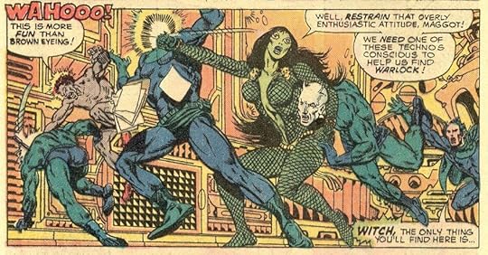 MAN-THING (Gerry Conway, Gray Morrow, Roy Thomas). Yes, his name sounds like a porn film, particularly when considering the unfortunately titled annual Giant-Sized Man-Thing. This dude was a straight-up monster, a lumbering swamp creature who didn’t talk or think. But he wasn’t a bad monster; he just didn’t want to be bothered. So, of course, someone was always bothering him. He was similar to DC Comics’ Swamp Thing, but Swampy became more of a full-fledged character and Man-Thing retained the shambling muteness of mobile nature. Steve Gerber (creator of Howard the Duck) did write some pretty trippy stories using Man-Thing as the springboard, stuff that was really more attuned to the world of indy comix. But give Marvel credit for letting Gerber get weird. And there are issues with terrific art by Frank Brunner and Val Mayerick.