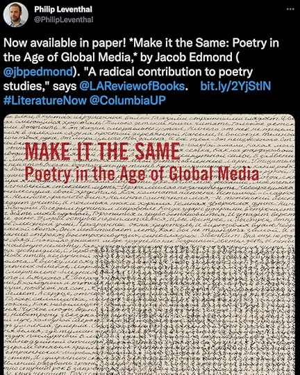 Make It the Same: Poetry in the Age of Global Media has just been released in paperback. It is now only $21 when purchased directly from Columbia University Press using the code CUP30 for a 30% discount.