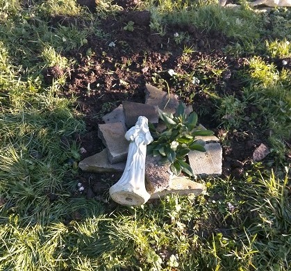 And now, 3 years later, I was watching him being gently carried away. Ann drove and chatted, I sat and listened, glad of her capacity to chat freely while all I had to do was sit there and listen. I was very conscious of Snowy lying resting in the back of the car, hoping that the boot door didn’t open, hoping that we got him safely to his destination. When we arrived, Ann showed me the grave she had dug so far. It sat up near a swing, the view of the fields and skyline beautiful. She had a plant ready to set on the grave; a plant that would grow into a bush with white flowers. She also had a cross and an angel statue. We needed to dig a little bit more of the grave to give him more room. The physical action of setting my foot on the spade and pushing it down felt strange. I hadn’t had a wink of sleep, I’d cried constantly. I hadn’t eaten and now I was moving down from my mind to my body, preparing this space for Snowy. When we had dug enough, we went back to the car to get Snowy. Again Ann took gentle charge of the situation. She scooped Snowy up in her arms; him still wrapped cosy in the blanket with the little toy beside him. I walked behind her as she climbed the incline next to her cottage. His little face bobbed along next to her. I remember in that moment, being blown away by her friendship. That this woman would help me so much in my hour of need; that she would carry my Snowy like a precious baby. I followed her along to the grave and she gently laid him down inside. It is a sight I cannot get out of my head. The sight of little Snowy lying in the grave. Tears flowed effortlessly.