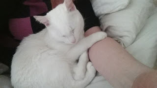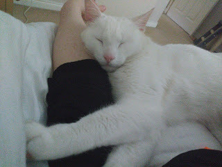 I lay down behind him and curled my arm around him. “Oh Snowy”, I cried. “I loved you so much”. I let the tears flow. I could hear Joe behind me; he was choking up too; obviously finding it hard to see his friend curled up next to her deceased cat.