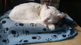 Joe and I looked at his wee body lying there. We decided we needed to get him comfy. I got the little blanket that Mum had sent me for Christmas. Snowy had lain on it a few times whilst looking out the window, watching the world go by. I moved his wee body onto one side of the blanket, then wrapped the rest of the blanket around him, with his little face poking out. It looked like he was just lying there sleeping.