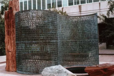 As you can see, it has letters carved into it. There are four panels, each enciphered in some manner by the sculptor. Three of those were deciphered years ago, but the fourth remained unsolved. A few days ago two men discovered that last text, although they did not actually decipher it. They found the original passage by following clues the sculptor left (both intentional and unintentional) that led them to the Smithsonian Institution where the sculptor had done research for the project. So the sculpture text has been broken, but the final cipher method has not been solved.