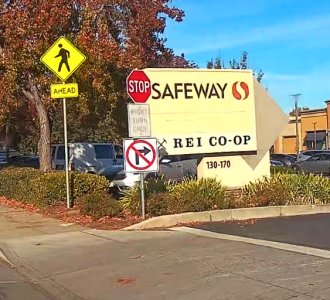 I think the Right turn only sign is for cars exiting the driveway and No right turns one for people wanting to enter. They’re at slightly different angles. I was probably making an illegal right turn into the parking lot as I got this photo. What adds to the confusion is the fact the driveway has a solid white line in the middle, suggesting that it is OK to turn in there. There is no Exit Only marking. That white line you see is the limit line for cars exiting but doesn’t extend all the way across, also suggesting the other lane is for entering cars.