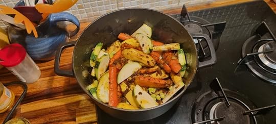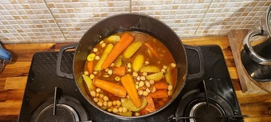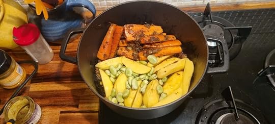Quelques oignons, carottes, pommes de terre, courgettes, fèves, épices… un peu d’eau, beaucoup de poivre…