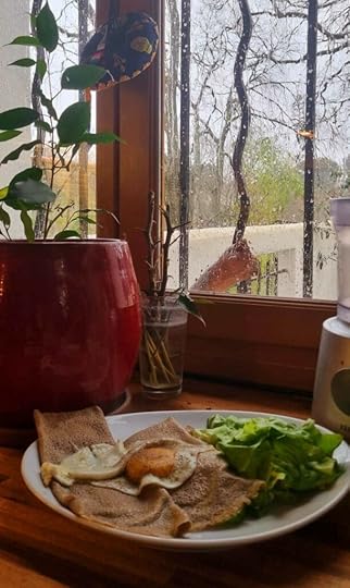 Autre ambiance à la maison : pluie = Bretagne = galettes 🙂 The repas de circonstance d’une part, et d’autre part, pluie = rester au chaud = farniente. Là, c’est plus coton… Nos minous pensant exactement la même chose, les places sont rapidement prises. Voyons voir… Le lit ?