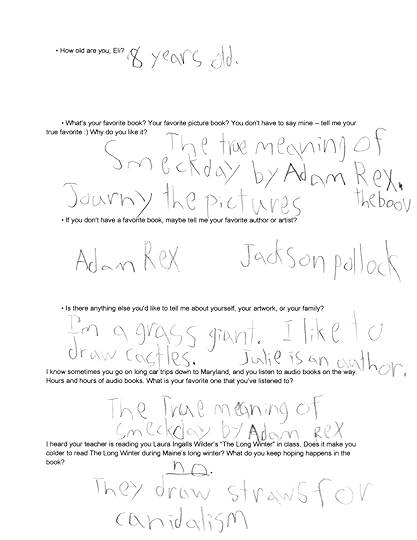 Eli happens to be the son of author Julie Falatko. Such a wacky coincidence! He lives in Maine, which makes me very jealous. Eli was nice enough to answer my questions last year but I didn't get to post his answers. The good news is that he gave me fresh answers this year, and now we get to see how Eli and his reading life have changed, which is really cool.