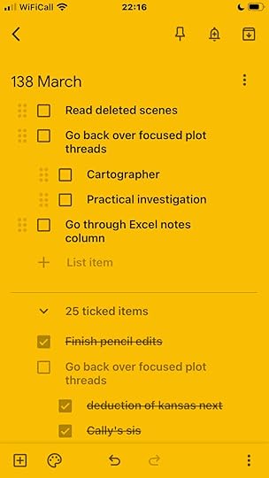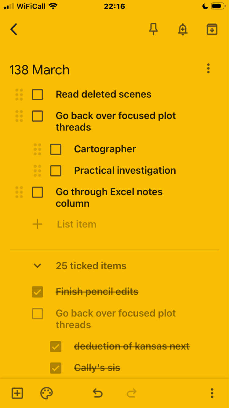 I have an ongoing note where I can add single-line bullet point ideas and refer back to it for inspiration. While I’m working on a novel, I’ll have notes to work out specific ideas on that book. I can categorise, save photos, add links to relevant web pages, make each project a different colour. When I’m working through an edit, I make a new note that’s a checklist of major points to address and check them off as I fix each one.