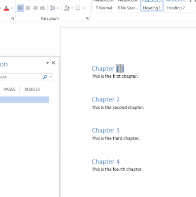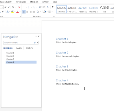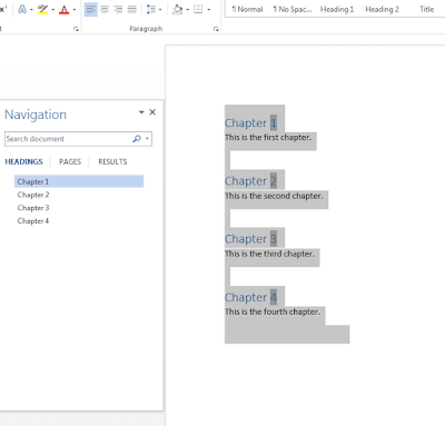 If you keep formatting each chapter title as a heading, you’ll quickly notice that each one appears in the navigation pane (usually on the left hand side of the document). If you can’t see the navigation pane, Hit CTRL+F as though you were trying to find a word or phrase in the document, and then click on HEADINGS: