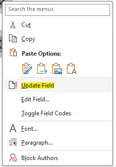 4. Select All and then right-click on any part of the selected text and then choose ‘Update Field’.