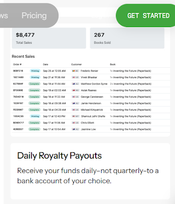 Snark. They go on to talk about how they were founded in 2022 and tell you very little about their pricing structure. You all know me. I ONLY look at the math when I'm thinking about a service. By the way, in case I didn't say, they ONLY do paperbacks. If we keep scrolling down, we see another math equation. 22 books sold, and 963 in royalties. This one is $41 per book. Um... What? I can't get a reader to pay $20 for a paperback, never you mind $30 or more. WTF?