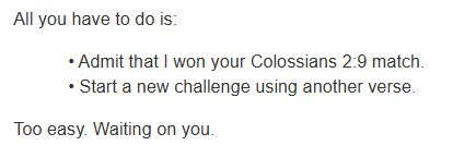 • Admit that I won your Colossians 2:9 match.Too easy. Waiting on you.