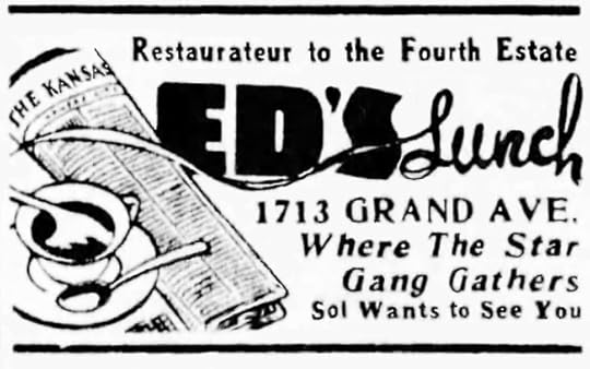 Newspaper workers, especially reporters and pressmen, made up a significant part of urban restaurant patrons in the 19th century and much of the 20th. Early on most of them were men, dropping in at all-night eateries of which there were many. Such eating places tended to choose locations close to the newspapers which were often grouped together in areas of a city referred to as “newspaper row.” [Above: advertisement for a Kansas City MO restaurant, 1940]