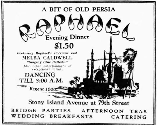 A reader of The American Restaurant would be left with the idea that Raphael’s was an elegant place catering to a clientele with sophisticated tastes. But that idea was dashed in a story written by a young reporter who spent a night there playing the part of a “shy cigaret girl.” Over the course of the evening male patrons hit on her nine times. She also observed people drinking alcoholic drinks, probably enhanced by their own whisky flasks. The crowd included teenagers. By June of 1929, the restaurant was reduced to featuring a “crystal gazer” on the balcony named Allah Mahalla. So much for elegance!