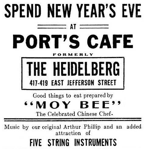 Chinese chefs also learned to prepare German dishes. James Beard and his mother were patrons of two Portland OR German restaurants, House’s and Huber’s, both of which were staffed by Chinese cooks. The venerable Huber’s was known for its turkey and cole slaw. Beard’s family meals were also prepared by a Chinese cook. [Above, Springfield IL, 1915]