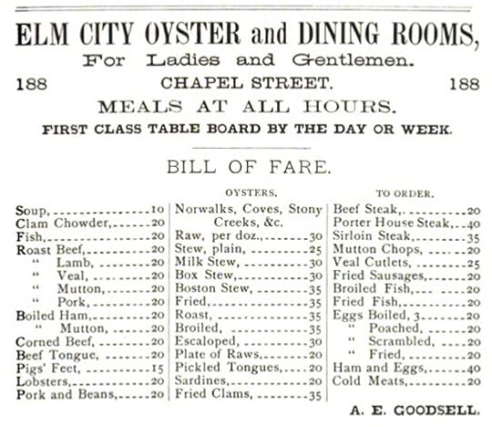 Oysters were tremendously popular in Eastern cities in the 18th century, yet although there were oyster stews available in eating places so far I haven’t found mention of box stews until the 19th century. [Above: Bill of Fare from New Haven CT in 1873]