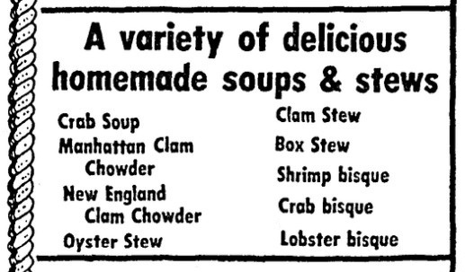 And then box stews disappeared. Or did they? Convinced that box stew was a dish of olden days I was quite surprised to discover a restaurant called the Atlantis Oyster House in Deptford NJ advertising it in 1984!