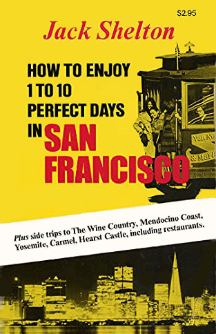 He began producing the newsletters in 1967, eleven years after he came to Sausalito, near San Francisco. His main occupation was producing direct mail advertising and fundraising appeals. But in 1959, before beginning his “private guide,” he had published a 94-page booklet called Jack Shelton’s Gracious Dining Guide to Outstanding Restaurants in San Francisco. Another venture was a popular book that he and his partner updated every few years called How to Enjoy 1 to 10 Perfect Days in San Francisco, which also included restaurants [shown above]. Both the guide book and the newsletter were co-authored by Jack Juhasz, but Shelton’s name was featured. Juhasz lived with Shelton and it’s likely they were life partners as well as business partners.