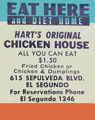 Hart’s Chicken House was said to have originated in El Segundo CA, but I can’t find out much about that. The partial match cover shown here probably dates from at least the late 1940s, so it seems unlikely that it was run by Hart then. Note that the price for chicken had tripled.