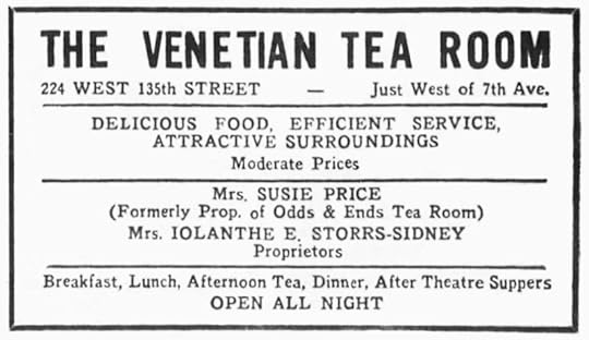 Odds and End’s Susie Price moved on in 1927, running the Venetian Tea Room with Iolanthe Sidney (full name: Iolanthe E. Storrs-Sidney). Iolanthe, a graduate of Talladega College who was socially active and well known in Harlem, took the role of hostess while Susie did the cooking. The tea room, known for its green and black decor, offered breakfast, lunch, and dinner, staying open all night with a la carte service. It became immensely popular very quickly. It was closed by October 1930 when a classified ad appeared offering “Complete Tea Room or Restaurant Equipment.”