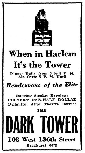 Another development in 1927 was the creation of the Dark Tower Tea Club, as part of the Walker Studio created in a town house by the daughter of Mme. C. J. Walker who became rich with her Black cosmetics business. Her daughter and business successor, A’Lelia Walker, carved out a tea room as part of the Studio. In line with the Studio’s emphasis on the arts, the tea room was highly decorative, with a red, green, and black color scheme and ebony furniture decorated with red. After beginning as a free service to Studio members, it began charging for tea. Still in business in November 1929 and in February 1930, it advertised on the earlier date that it was “serving dinner daily” and had music and dancing.
