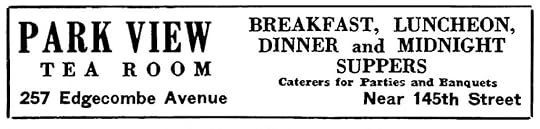 It is somewhat difficult to know what to make of the elite Park View tea room that overlooked Bradhurst Park in northern Harlem. This is because of the coy wording of “Lady Nicotine” who wrote a column called “Between Puffs” for the Tattler. In a 1927 column she described the area as “most fashionable” and seemed to gush over the Park View’s “ample room for dancing.” She then said it was “poetic enough, if you get what I mean, to offer to its clientele caviar, anchovies, and stuffed truffles,” adding that “when you have followed one of its dinners . . . you have consumed well over your one quart.” Not sure I get what she means, but it could be interpreted as saying that alcoholic beverages were plentiful there.