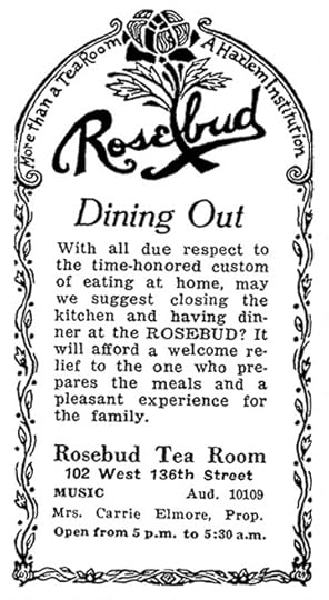 It seems there were two tea rooms named “Rosebud.” One [advertisement shown above] was run by Carrie Elmore, stayed open all night, and offered “Hot Steaming Dinners in Roasted Meats and Fowls” and “Delicious Coffee served with pure Cream.” The other, at 413 Lenox Avenue, was operated by Mrs. Lucille Pitts. A 1932 blurb said its decor was “a marvel of the decorators’ art . . . skillfully disguised to resemble a bower of roses” and serving chicken a la Maryland, corn fritters and “every known variety of sea food. It was open all night, serving “predawn breakfast.”