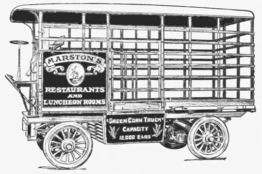 Popular menu items at Marston’s restaurants included corned beef hash and green corn, i.e., corn picked early. Shirley Marston, grandson of Russell, opened a cafeteria in 1926 which featured green corn in season. He emphasized in a 1926 interview that his cafeteria was the only place he knew of where “corn picked before sunrise is served the same day.” [Shown above: 1911 ad; Below: 1906 wagon that brought the green corn from the Marston farm]