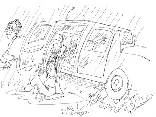 He showed me another cartoon he drew. It was of me, but more of one of the stories I shared. It was the story about getting into my car but falling into a rain puddle and how an old lady picked me up out of it. I loved it!