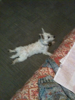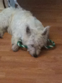 This is our super cute dog, Amp. He plays hard ad sleeps hard. This is him laying on the floor in the kitchen on his new favorite rope toy: