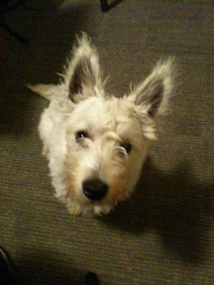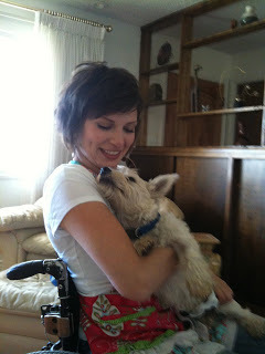 This is Meg. She is my second-favorite person in the world! Well, third if a visitor comes over. Fourth if they bring a friend... Everyone comes over to see me. I just can’t help the popularity. When they come, anyone who comes, that is, they have come to pet me and hold me and throw stuff for me. It is such the wonderful existence! They just can’t get enough of me! But back to Meg - I like that she is a perma-lap for me to sit on. My short legs are too stumpy to jump very high, so I wait at the edge of the deck or couch so that can jump on Meg's lap when she rolls by. She loves it when I do this, especially when I've been playing in the mud and she's off to teach or speak. I think paw prints on a nice dress are exactly the right touch...