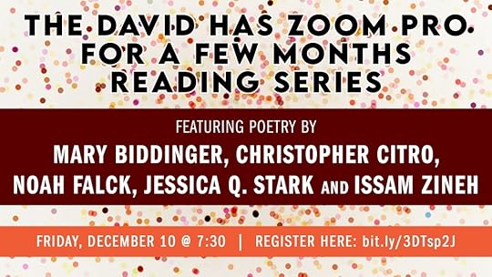I’m also so excited to be reading for the David Has Zoom Pro Reading Series tonight, Friday, 12/10, at 7:30 pm EST. Registration link here!