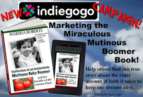 If you’ve ever thought about doing a crowd funding campaign yourself, this should interest you very much! We are now full into the project and I’ll be blogging on my experiences in researching how best to go about this, putting together all the initial material and the follow through that has to be done daily. It’s quite an undertaking! But I’ve always believed that I was given the lessons in “Confessions of an Instinctively Mutinous Baby Boomer and her Parable of the Tomato Plant” to share with as many people as possible. And I intend to do just that! Hopefully, this Indiegogo campaign will give a real boost to our efforts. You’ll find a link to our Indiegogo campaign in Bob’s blog and we would very much appreciate it if you would take a moment to go there, Like & Share it, etc. ~ thanks in advance!