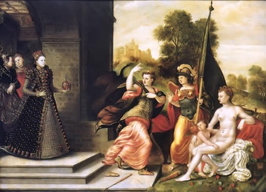 “Elizabeth I and the Three Goddesses,” by Hans Eworth, 1569; Elizabeth actually owned this painting, which both associates her with the Goddesses and has her besting Them, for she kept the golden “apple” or royal orb for herself.