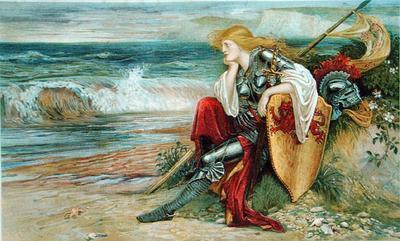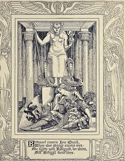 “Britomart” by Walter Crane, 1900Britomart kneels down and prays at the Goddess’ feet. The wand in the hand of “the Idoll” moves, which Britomart takes as a sign of good fortune and falls asleep: “There did the warlike Maide her selfe repose, Vnder the wings of Isis all that night…” The priests, too, went to sleep and “on their mother Earths deare lap did lie.” They kept strict chastity and eschewed both meat and wine (especially wine).
