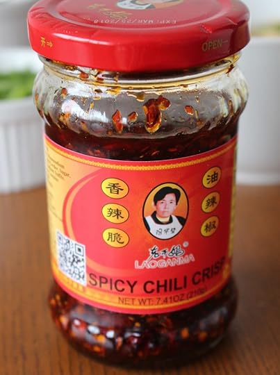 The sauce is called Lao Gan Ma spicy chili crisp and though it may look like your typical chile oil, it’s actually a crunchy, spicy elixir unlike anything I’ve ever tasted. Even just opening the jar and breathing in its savory perfume makes my mouth water. There are red pepper flakes, but also tongue-tingling Sichuan peppercorns, bits of caramelized onion, fried soy beans adding crunch and texture, a hint of salt. The result is a spicy, but far from searing – it’s a reasonable heat – and also utterly addictive. If you don’t currently have a bottle in your cupboard, I suggest you sprint to the nearest Chinese grocery store and buy one.