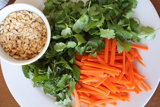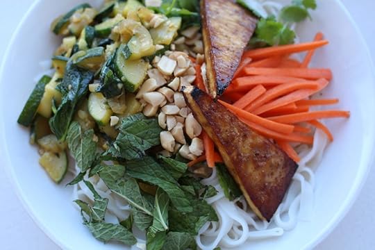The book has a recipe for Vietnamese noodle salad bowls, topped with shiitake mushrooms, broiled tofu, and Pat’s own vegan “fish” sauce (which is flavored with kombu). But I was craving the hot-cold combination of bò bún, which mixes fresh herbs and vegetables with slippery noodles and stir-fried lemongrass beef and onions – so I decided to mix-and-match a few recipes from the book and create my own. In lieu of lemongrass beef, I made Pat’s Thai basil zucchini, which has similar flavor notes – sweet, savory, and spicy. I mixed up a dipping sauce of fish sauce, lime juice, water, and sugar – and I abstemiously substituted the book’s broiled tofu for a spring roll. Sprigs of fresh cilantro, mint, crushed peanuts, and slivered carrots topped the dish (and if you’re feeling fancy, the book has a recipe for quick-pickling the latter).