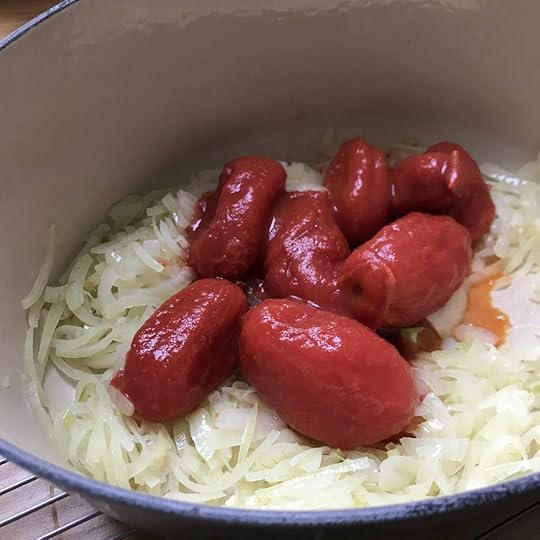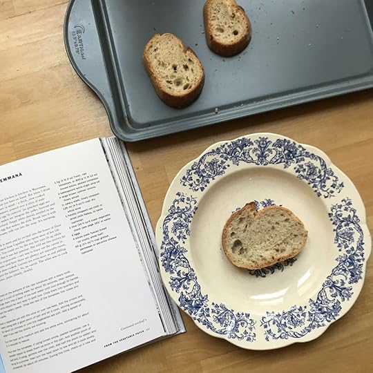 I halved Emiko’s original recipe, but somehow it still made enough for four portions. You can use peeled, fresh tomatoes instead of canned, and stock instead of water. The bread should be stale, not toasted – toasting alters the flavor, as Emiko points out – and so I dried my slices in a low oven.
