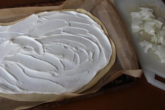 Spread the sour cream evenly over the dough leaving a 1/2-inch border. Distribute the slivered onions in an even layer.