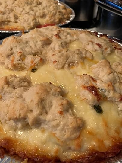 — tomatoes, lemo mayo sauce, basil, and biscuit crust with cheddar pressed and baked into the top —