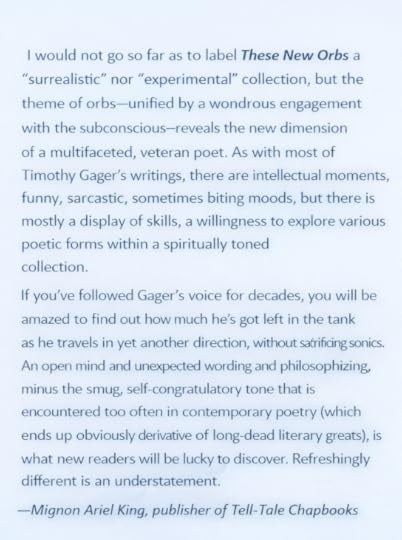 "Grounded in humility,These New Orbs is a book of reckoning and radiance, conjecture and contemplation. Inthis brilliant collection, Timothy Gager draws on astronomy, myth, memory,family history, and contemporary life to fashion poems of exquisite imagery andsonority. The “orbs” of the title become, as one experiences the wholecollection, recurring emblems—of loss and survival, desire and distance, andthe poet’s dead who remain with him, with us. Angels, eggs, planets, memories,eyes, ghosts, regrets and promises, the emotional range of these poems isvast. Gager is a sensible mystic,desirous of the light, searching, skeptical and earnest. As he writes in“Signs,” Maybe the light only finds/ those who have stopped looking. Fierce,tender, funny, and unafraid, Gager’s work conjoins vision and craft to offer usif not consolation, clarity. I feel grateful for these poems."