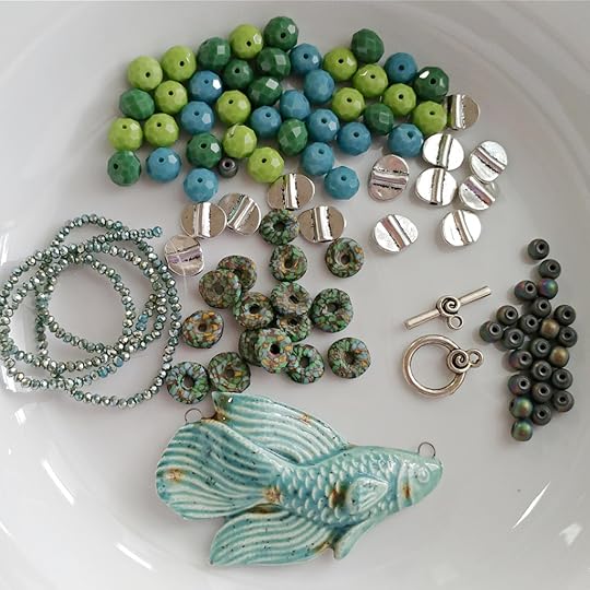 The handmade ceramic fish pendant is made by Michelle McCarthy, an artist whose work I’ve admired and purchased in the past — but never anything like this! Lisa also sent a sterling silver toggle, silver accent beads, various Czech glass, African beads with an iridescent coating, Greek ceramic spacers, and (missing on school photo day) matte glass disks. I am a sucker for Czech glass and the sparkling tiny tiny beads are my favorite.