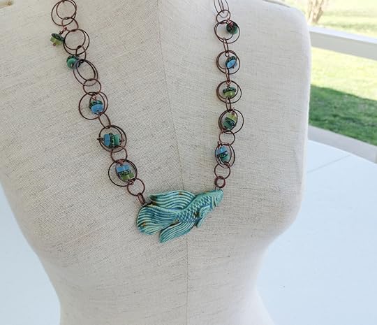 The first piece I made did not come easily. When I looked at the fish pendant, I had an idea, but that idea refused to work in actuality. I kept trying to force it to work and ended up completely frustrated and feeling creatively stunted. After a stern talking-to by my Rational Self, I let go of my plan and started pulling beads, wire, and chain based on the brown accents in the fish.