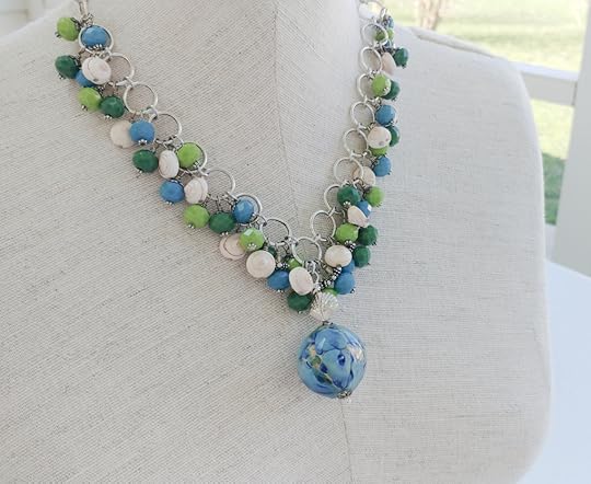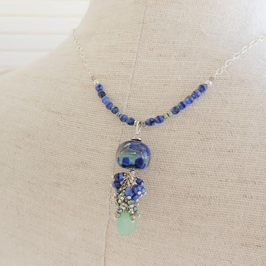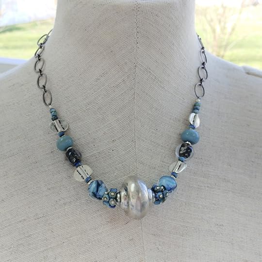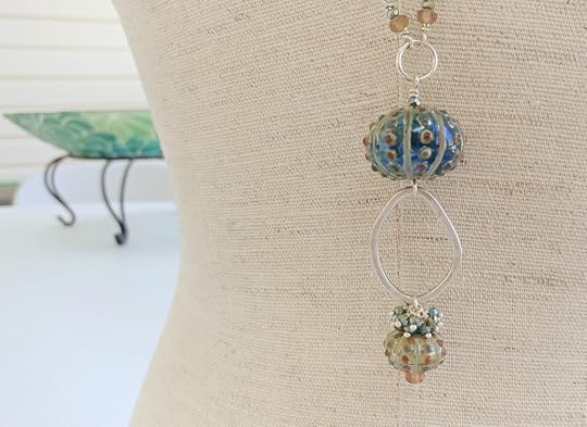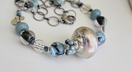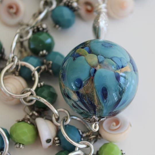 The next piece incorporates the silver accent beads Lisa sent me. I added lampwork glass I made and a sterling silver focal that reminds me of a shell. This one also has a fish clasp.