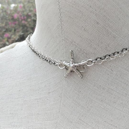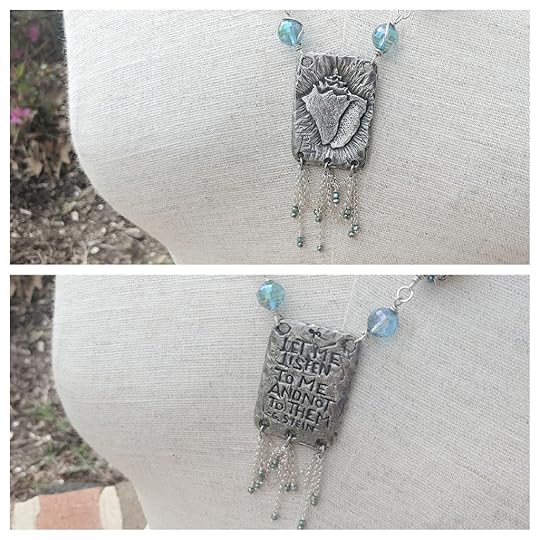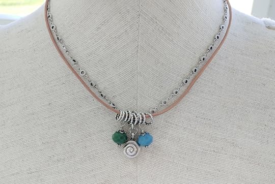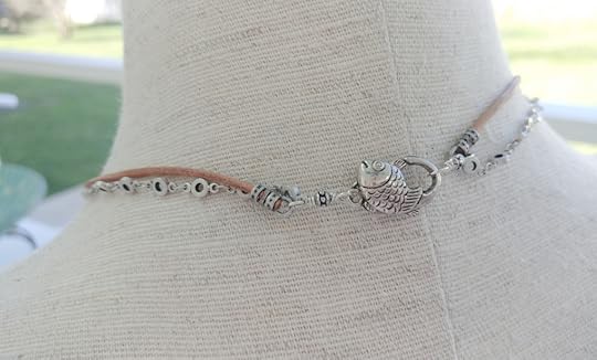 I found the Karen Hill Tribes silver shell charm, leather cord, and a cool length of chain in my stash. Simple but I quite like it. The ocean theme continued with a fish clasp I had on hand.