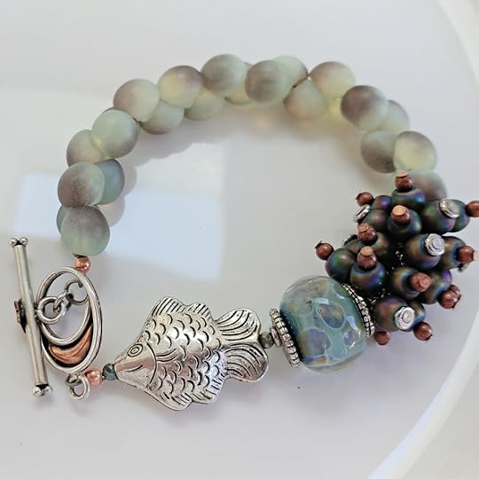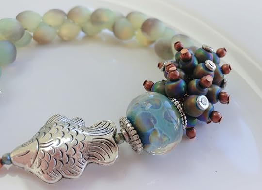 Next is a bracelet, and I used all of the African beads Lisa sent. The cluster makes me think of a sea anemone and the colors of the Czech button beads, lampwork glass, and silver fish carried on the ocean theme.