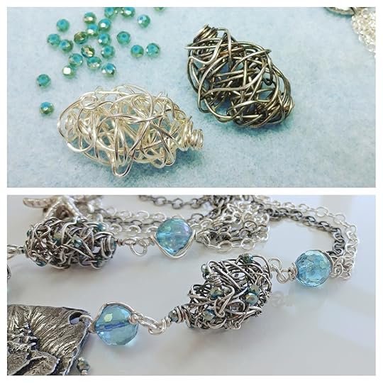 This next piece took the most work. I wanted to make something that invoked the idea of tangled seaweed and ocean floor grasses, or maybe even nets or wicker fish traps. I made these tangled beads from scratch. I wrapped 20 gauge wire around and around a mandrel, then ran it through a liver of sulphur bath to patinate. I brushed off some of the patina for depth and using 26 gauge wire, “sewed” on my favorite sparkling beads from Lisa, and finally used pliers to twist the tangles up even more.