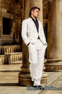 In terms of cut, we went with a classic “Italian” thin-man cut. Think “Armani or Gucci.” These suits don’t usually suit wider frames, because they are tailored and form fitting. They’re meant to create harsh and clean lines. We did pad your shoulders just a wee bit to give you that extra balance. We want to really bring out that “triangle” silhouette. We did cut thin lapels, but you’ll note that you do have a vent in the jacket. Most Italian suits don’t feature them, but we figured it would be nice to have the extra freedom of movement. The outfit has a white double-collared shirt and matching cobalt silk tie with elfish striations. And Brenda threw in your Nevernight Aviator shades. But don’t embarrass me, son. You be sure to take them off during the ceremony. Now, here, take your old clothes. Now, why don’t you go make yourself useful, and go be that girl’s “something blue.”
